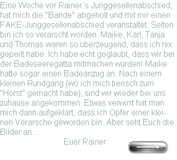 Auf dieser Seite gibt es jede Menge Bilder von unserer Hochzeit am 15.08.2008 zu sehen. Es gibt aber auch Fotogalerien von den anderen "Events"wie z.B. die Jungge-sellenabschiede oder den Polterabend. Falls Ihr von dem ein oder anderen Bild ein Abzug haben möchtet, dann notiert bitte den Namen von dem Bild inkl. der Bilder-nummer(z.B. Standesamt002) und gebt uns Bescheid.Wir werden aber auch ein Fotoalbum mit "echten"Bildern fertig machen und dieses weiterreichen. Es sind leider noch nicht alle Bilder da, deswegen habt bitte noch ein wenig geduld! Wir wünschen Euch erst mal